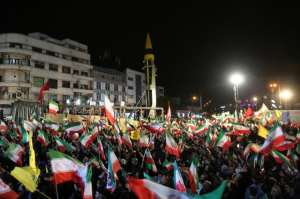 Tahran’da düzenlenen protestolarda binlerce kişi ABD ve İsrail’i hedef alırken, gösteri alanlarına balistik füzelerin getirilmesi dikkat çekti.
