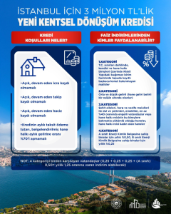 Çevre, Şehircilik ve İklim Değişikliği Bakanı Murat Kurum, sosyal medya hesabından yaptığı açıklamada İstanbul için hazırlanan 3 milyon TL’lik kentsel dönüşüm kredi paketinin detaylarını paylaştı. Kurum, ilk yıl ödemesiz, 180 ay vade, 0,69 faiz oranıyla, 3 milyon TL’ye kadar kredi finansmanı sunulan dev destek paketine dair merak edilenleri, başvuru süreci ve kredi şartlarını tek tek açıkladı.