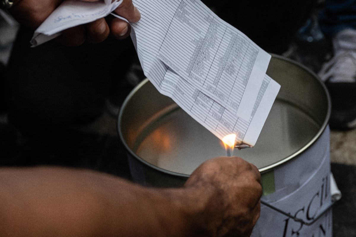 Basın açıklamasının ardından işçiler, yanlarında getirdikleri maaş bordrolarını yaktı. (AA)