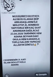 Adana’da sosyal medya üzerinden “karakola ve okula saldırı yapacağız” paylaşımlarında bulunan şahıs gözaltına alındı.