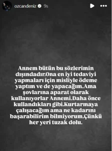 Özcan Deniz’in kanser tedavisi gören annesi Kadriye Deniz, 30 Aralık’ta hastaneye kaldırıldı. Gürler, o anları “Dayan annem” notuyla paylaşmıştı.