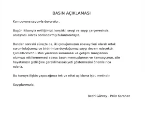 Bugün itibarıyla evliliğimizi, karşılıklı sevgi ve saygı çerçevesinde, anlaşmalı olarak sonlandırmış bulunmaktayız. Bundan sonraki süreçte de iki çocuğumuzun ebeveynleri olarak ortak sorumluluğumuz ve birbirimize duyduğumuz saygı devam edecektir. Çocuklarımızın üstün yararının korunması ve gelişim süreçlerinin olumsuz etkilenmemesi adına; basın mensuplarının ve kamuoyunun aile hayatımızın gizliliğine gerekli hassasiyeti göstermesini önemle rica ederiz. Bu konuya ilişkin yapacağımız tek ve nihai açıklama işbu metindir. Saygılarımızla, Bedri Güntay – Pelin Karahan.
