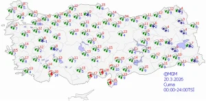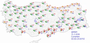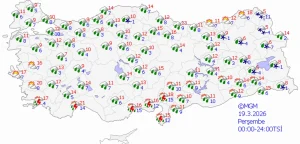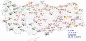 Bugün ülkenin güney, iç ve doğu kesimlerinin parçalı yer yer çok bulutlu, Adana, Mersin, Osmaniye, Hatay, Rize, Gaziantep, Kilis, Diyarbakır, Mardin çevreleri ve Artvin’in kuzeyi ile zamanla Kıyı Ege ve Antalya çevrelerinin yağmur ve sağanak yer yer gök gürültülü sağanak yağışlı geçeceği tahmin ediliyor.