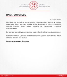 Bakanlıktan konuya ilişkin yapılan yazılı açıklamada, “Bazı internet siteleri ve sosyal medya hesaplarından, Hazine ve Maliye Bakanımız Mehmet Şimşek adına kurgulanmış, yatırım tavsiyesi içerdiği izlenimi veren asılsız röportaj ve paylaşımlar dolaşıma sokulmaktadır. Bu içerikler gerçeği yansıtmamakta olup dolandırıcılık amacı taşımaktadır.” ifadelerine yer verildi.