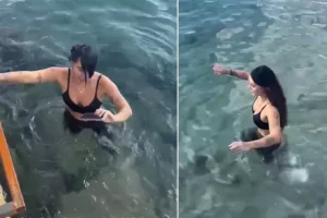 Yasemin Yörük, İstanbul’a dönmeden önce sahilde kahve keyfi yaparken telefonunu denize düşürdü. Telefonunu kurtarmak için denize giren Yürük, çaresizce yaptığı aramayı arkadaşının kayda aldığı görüntülerle sosyal medyada paylaştı.