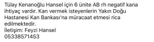 Tülay Kenanoğlu Hansel için 6 ünite AB rh negatif kana ihtiyaç vardır.